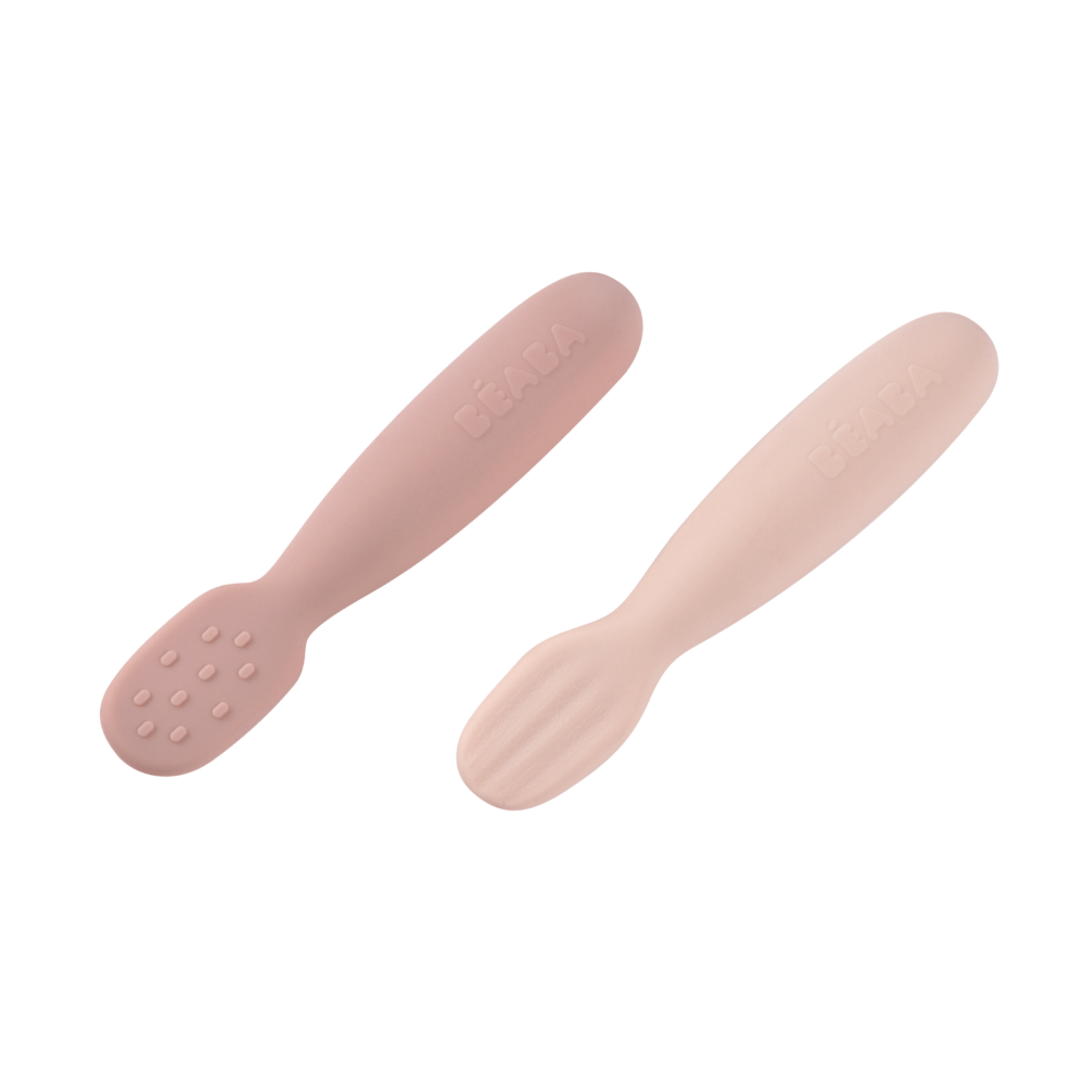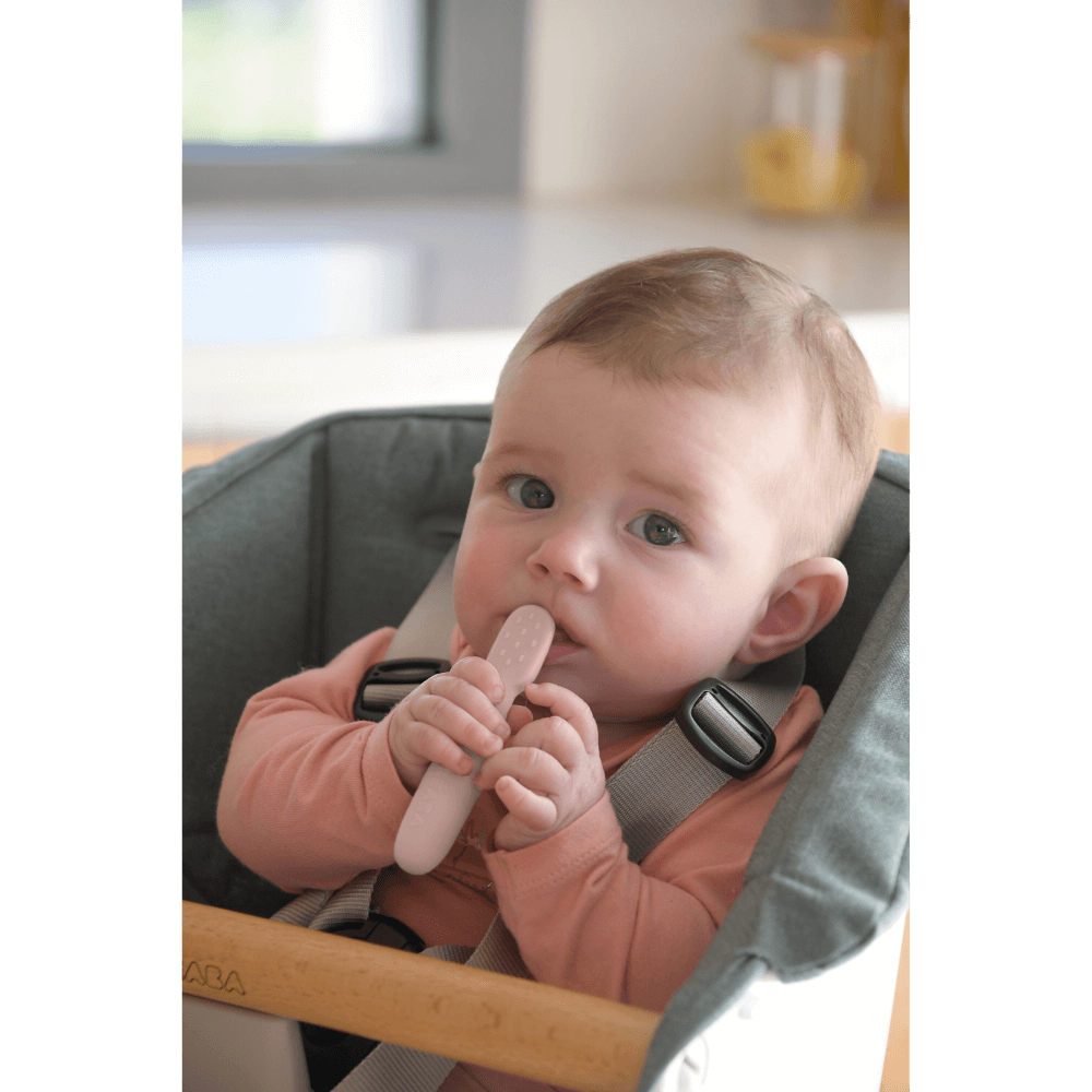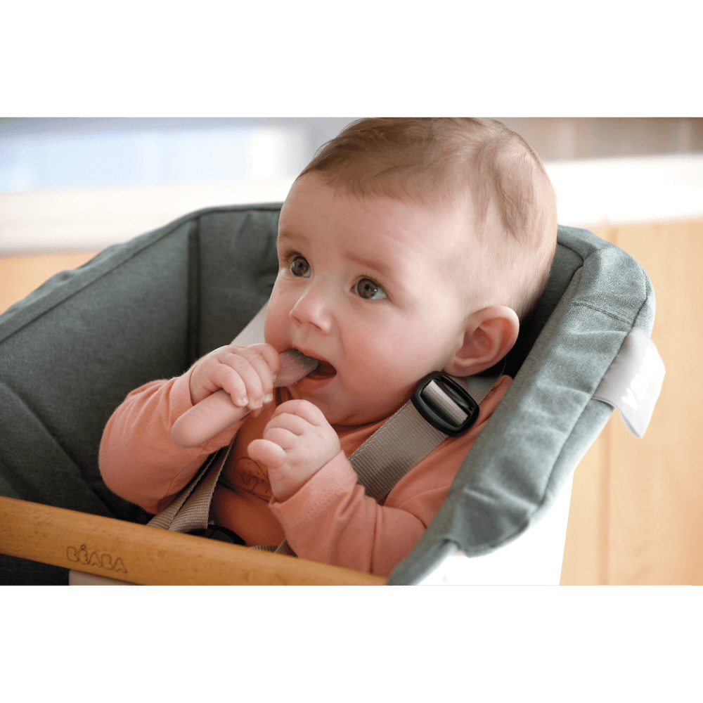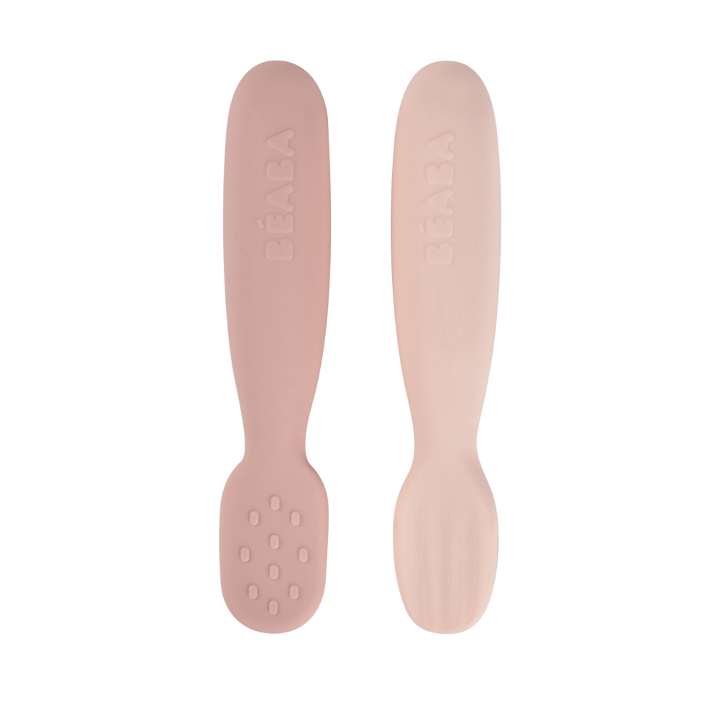 Beaba Silicone Pre-Feeding Spoons, ideal for babies 4 months and up. Designed for tiny hands, these soft, flexible spoons feature textured tips for better food grip, flat dual-sided heads to prevent overfilling, and ergonomic short handles for early self-feeding. Made from BPA-free silicone and developed with infant feeding experts, they’re safe, gentle on gums, and dishwasher safe for easy cleaning.