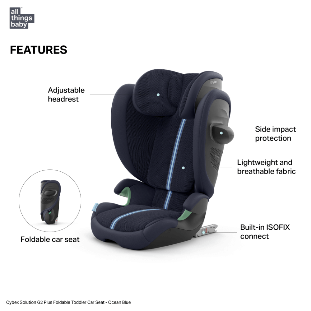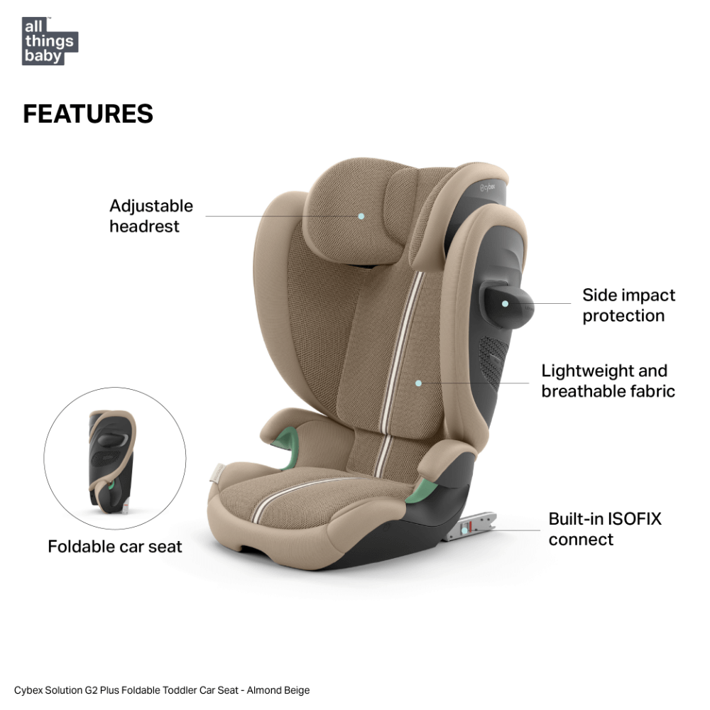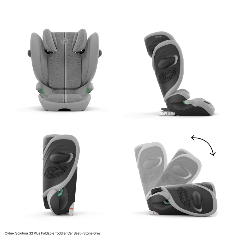 The Cybex Solution G2 Plus is foldable high-back booster car seat that grows with your child. Lightweight and compact design that folds within seconds with a helpful carry handle. It is an excellent fit between safety and ease of use with a side impact protection and seat-belt or included ISOFIX connectors installation method. The patented adjustable headrest, reclining function, and breathable mesh fabric offers children added comfort when you are on-the-go.