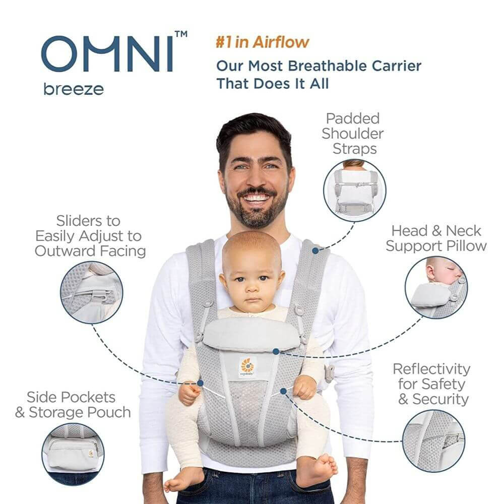 The Ergobaby Omni Breeze Baby Carrier in Slate Blue brings breathability to the next level. Rated number 1 in Airflow* when tested with comparable carriers, the Omni Breeze uses SoftFlex Mesh fabric to maximize airflow, keeping you and your baby comfortable and dry all day.