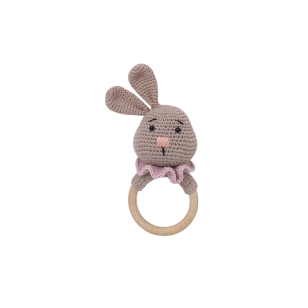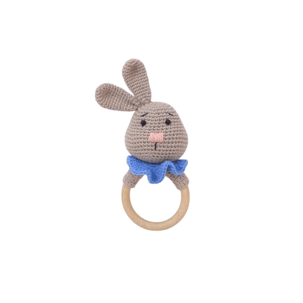 Lovingly handcrafted from the softest cotton yarn, this adorable bunny features floppy ears, a rosy pink nose, a cute ruffled collar and a smooth wooden ring — perfect for tiny hands to grasp and shake. Designed to stimulate your baby’s senses and encourage motor skill development, this lightweight rattle makes a soft, soothing sound that’s as comforting as a hug.