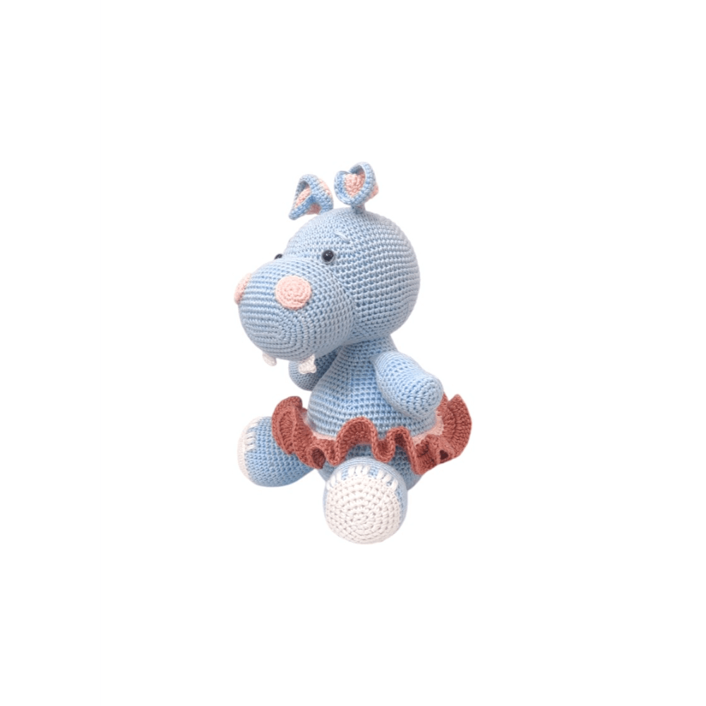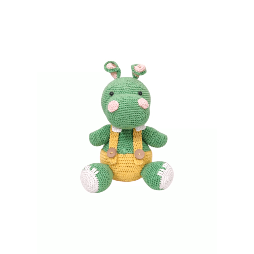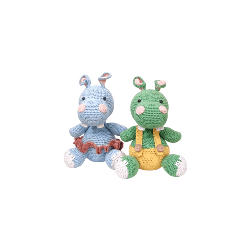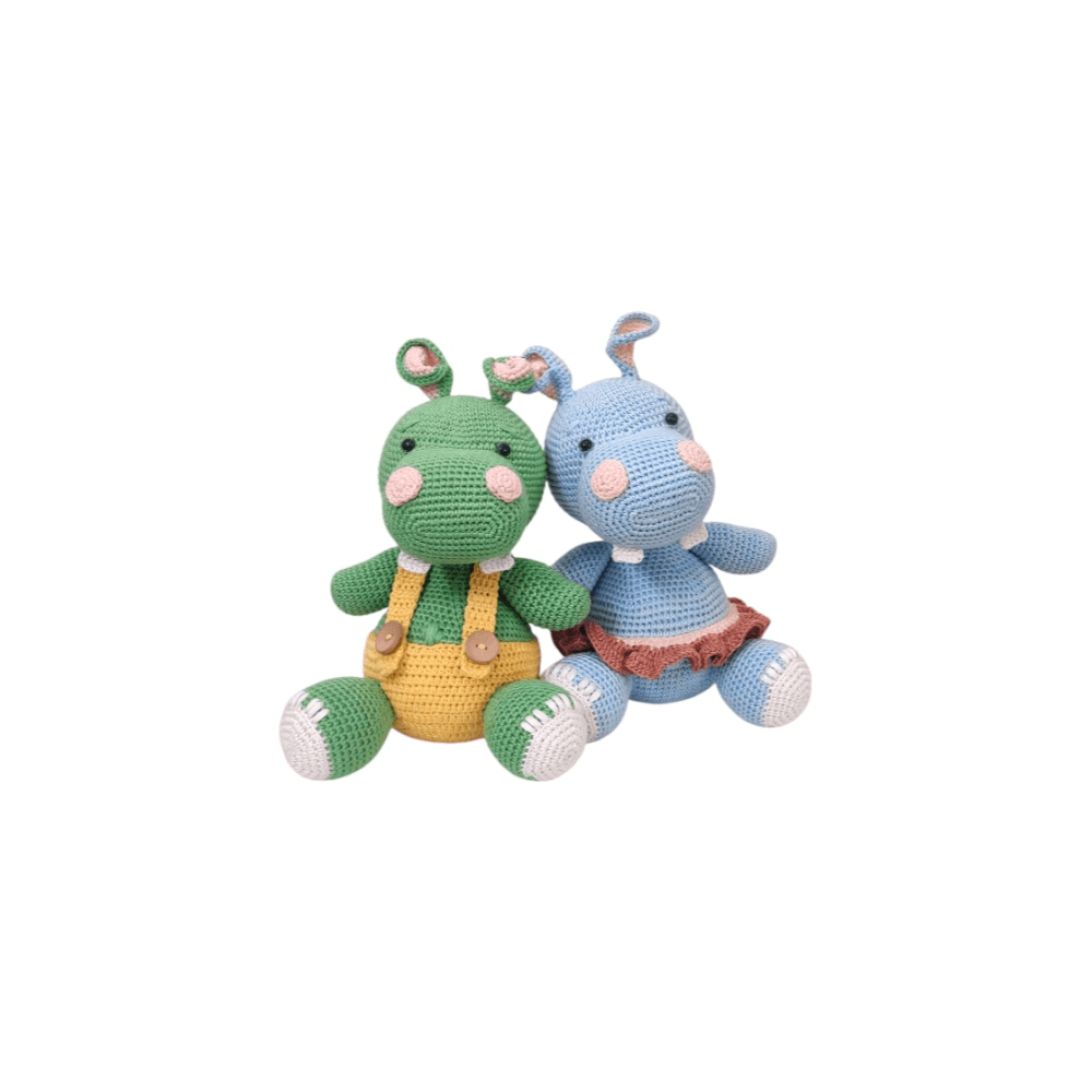 These delightful tootsie siblings bring great charm and fun with their adorable outfits and friendly faces. Whether it's playtime, Storytime, or cuddle time, this lovable duo is ready to tag along. Hector is dapper in his sunny yellow overalls with buttoned suspenders, while Holly twirls in a sweet frilly skirt that’s perfect for tiny tea parties and big bear hugs. Carefully crafted from soft cotton yarn, they’re built for play and made to last. Ideal for gifts, sibling sets, or adorable nursery companions Add a splash of color and a whole lot of love and laughter to your little one’s world with these Happy Hippos!