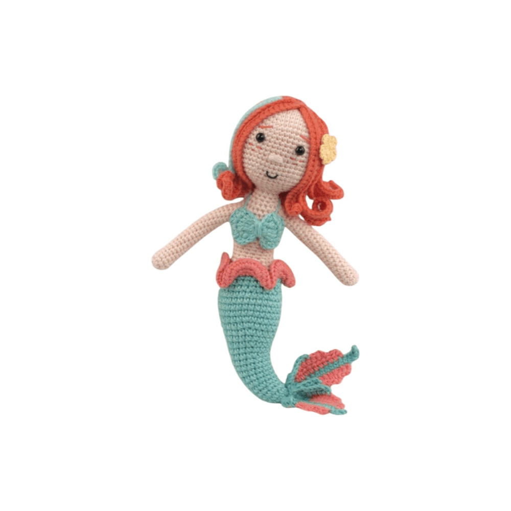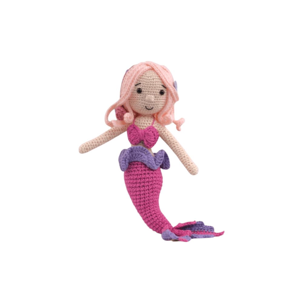 Dive into a world of wonder with our Mermaid, a beautifully handcrafted crochet doll designed to spark imagination and endless adventures! With her vibrant hair, seashell top, and floppy tail, she brings the enchanting ocean life straight into your arms. Every detail — from her delicate curls to her colourful tail fin — is lovingly stitched, making her a safe and cuddly companion for all ages. An enchanting gift for birthdays, baby showers, or ocean-loving little ones. Whether she’s swimming through playtime or snuggling at bedtime, The Mermaid is ready to make a splash in your little one’s heart. Bring home a touch of marine magic with the Mermaid dolls — where every cuddle feels like a seaside adventure!