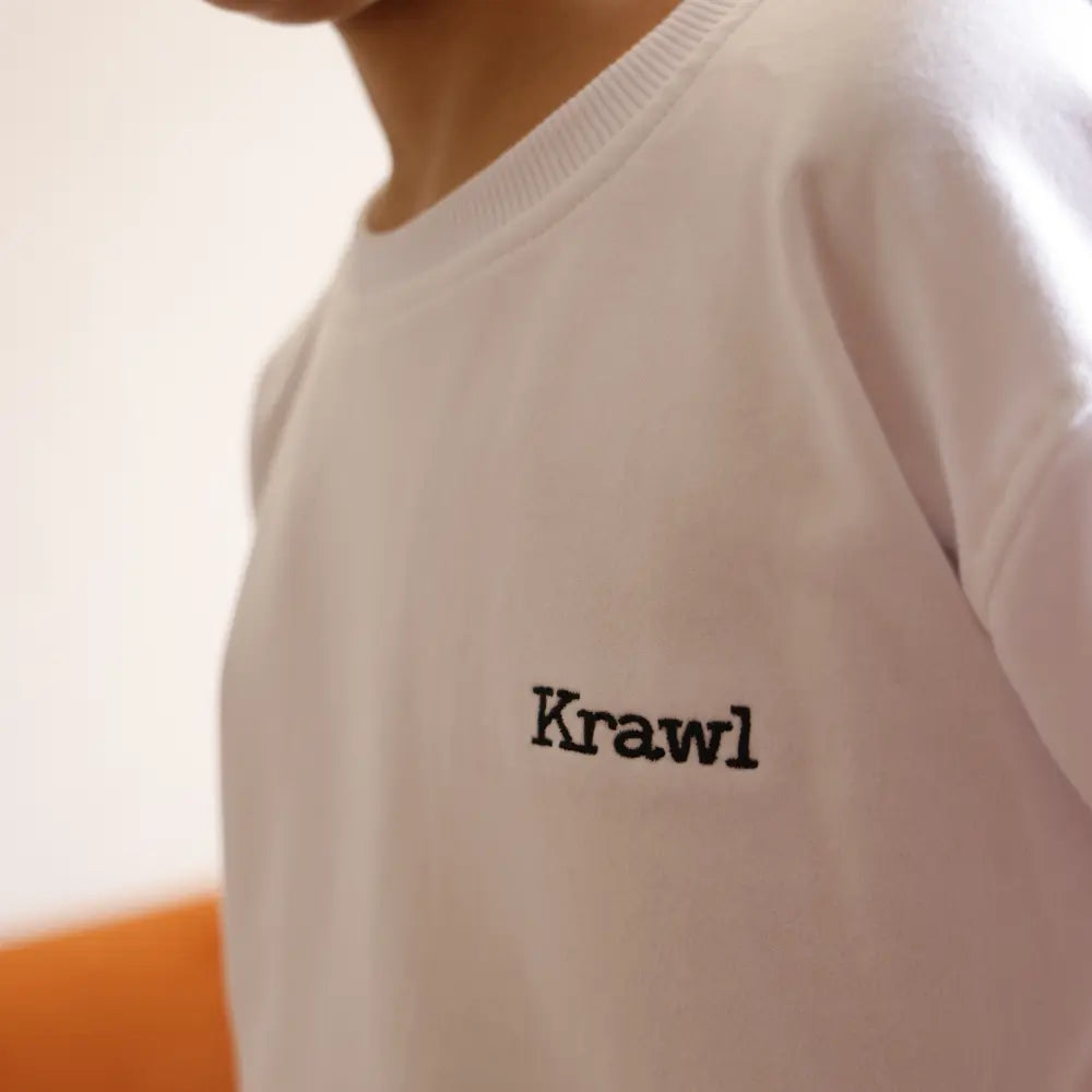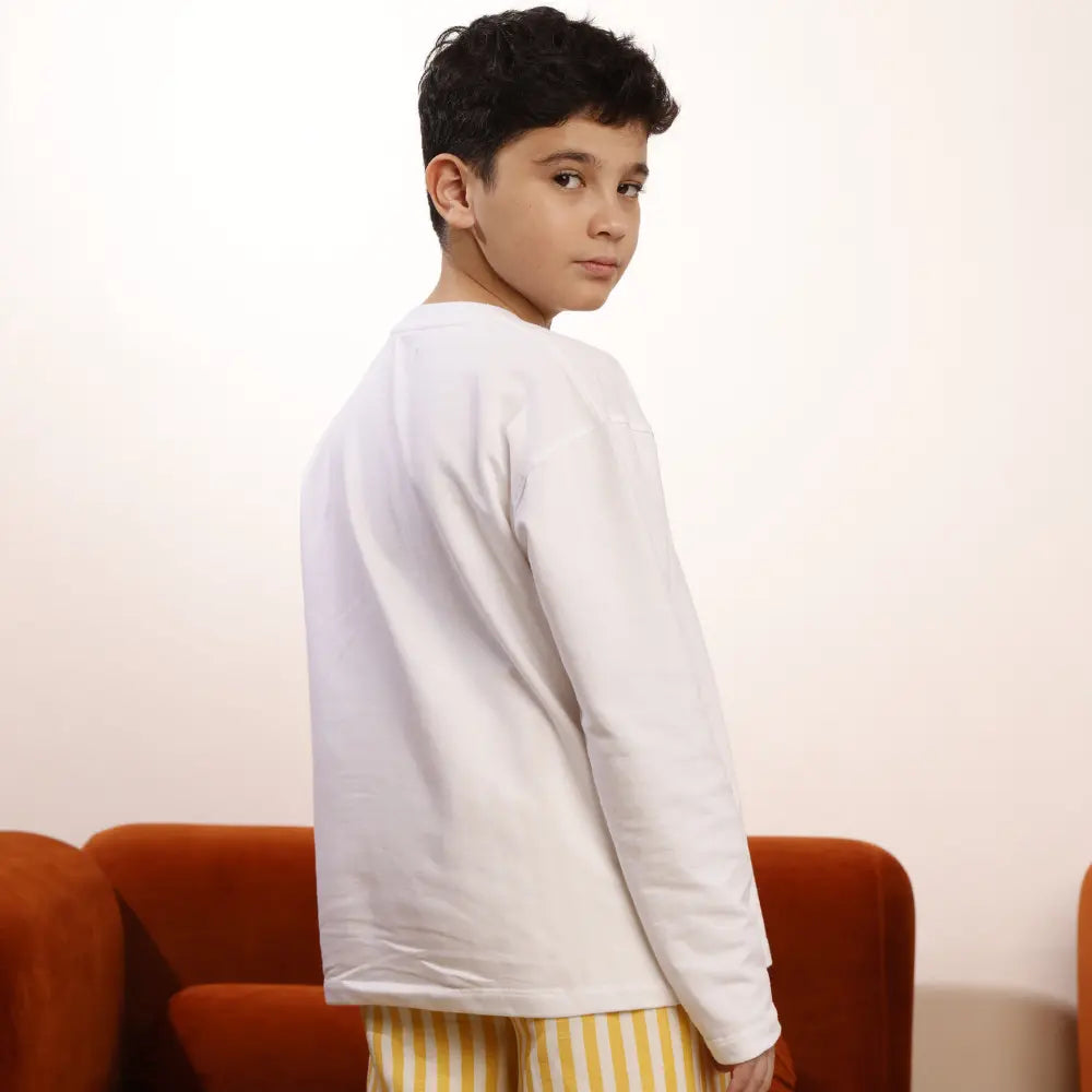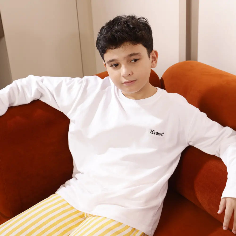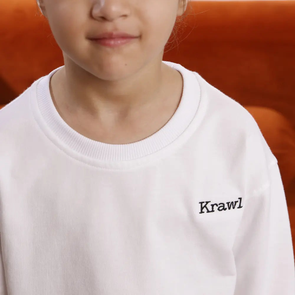 A milky-coloured long sleeve tee with an embroidered accent logo. A casual, relaxed fitting style with dropped shoulders and a round neckline.