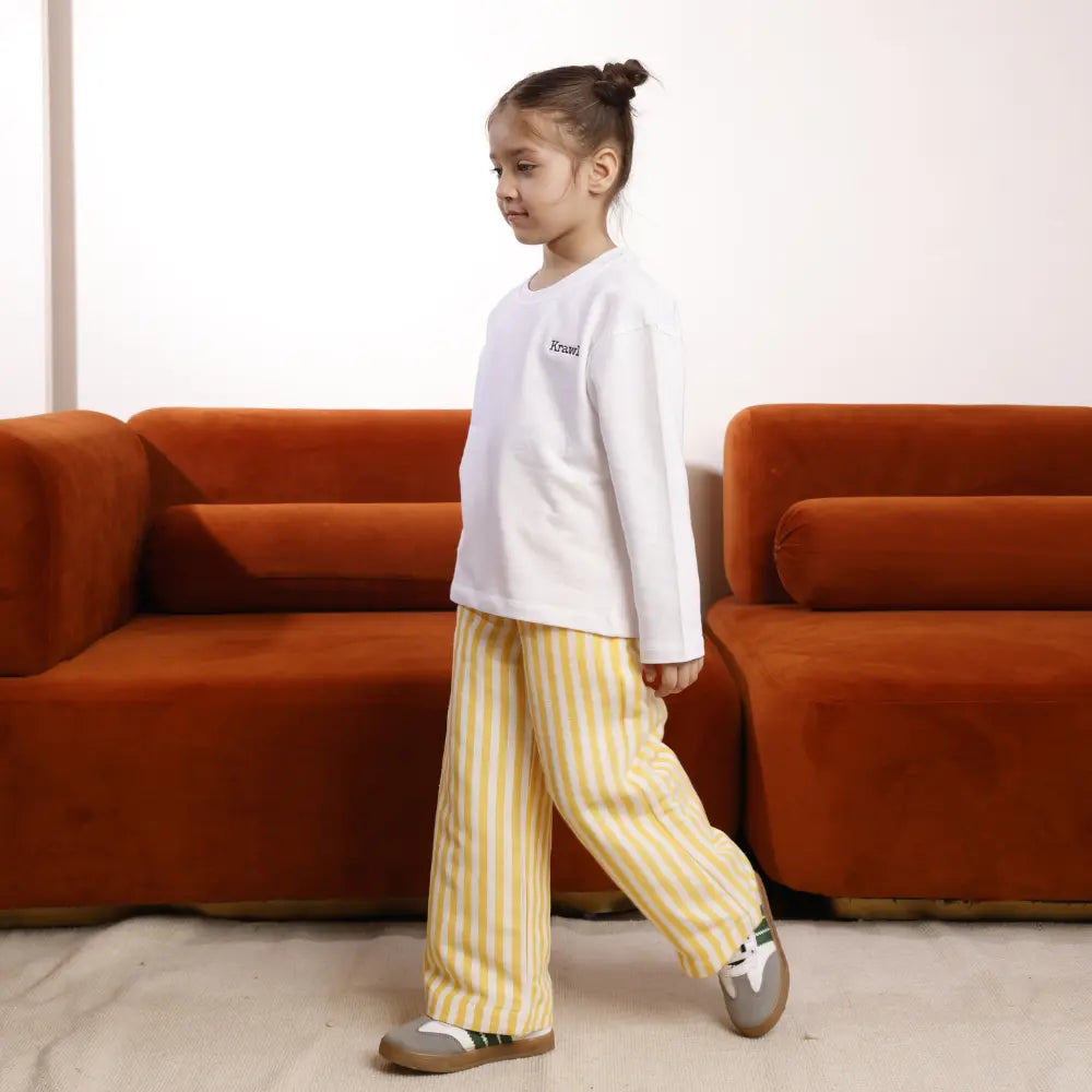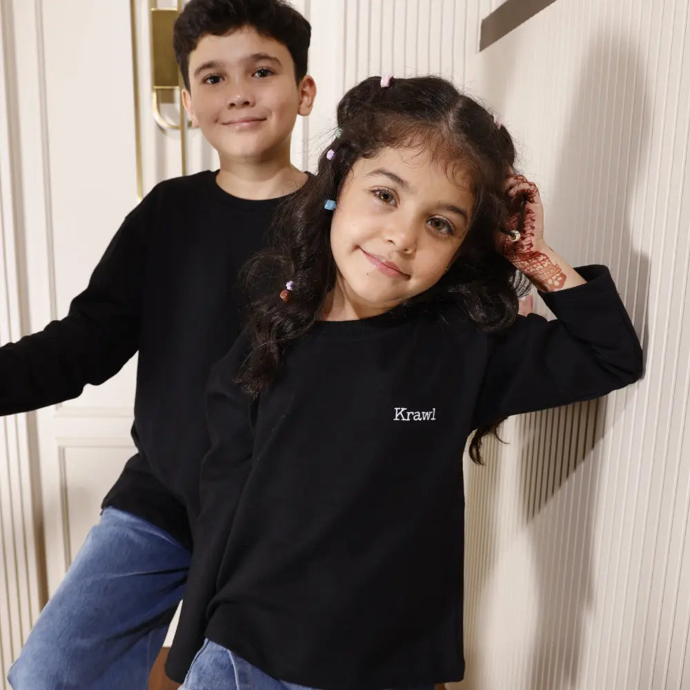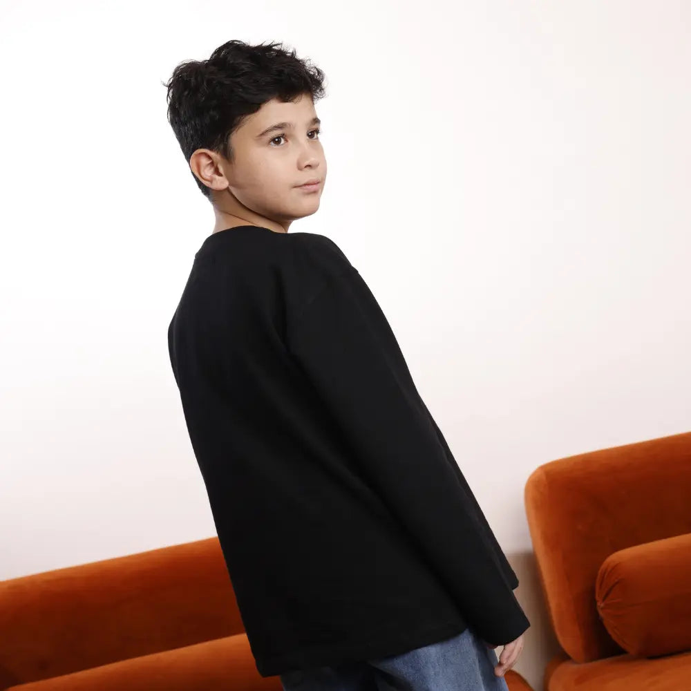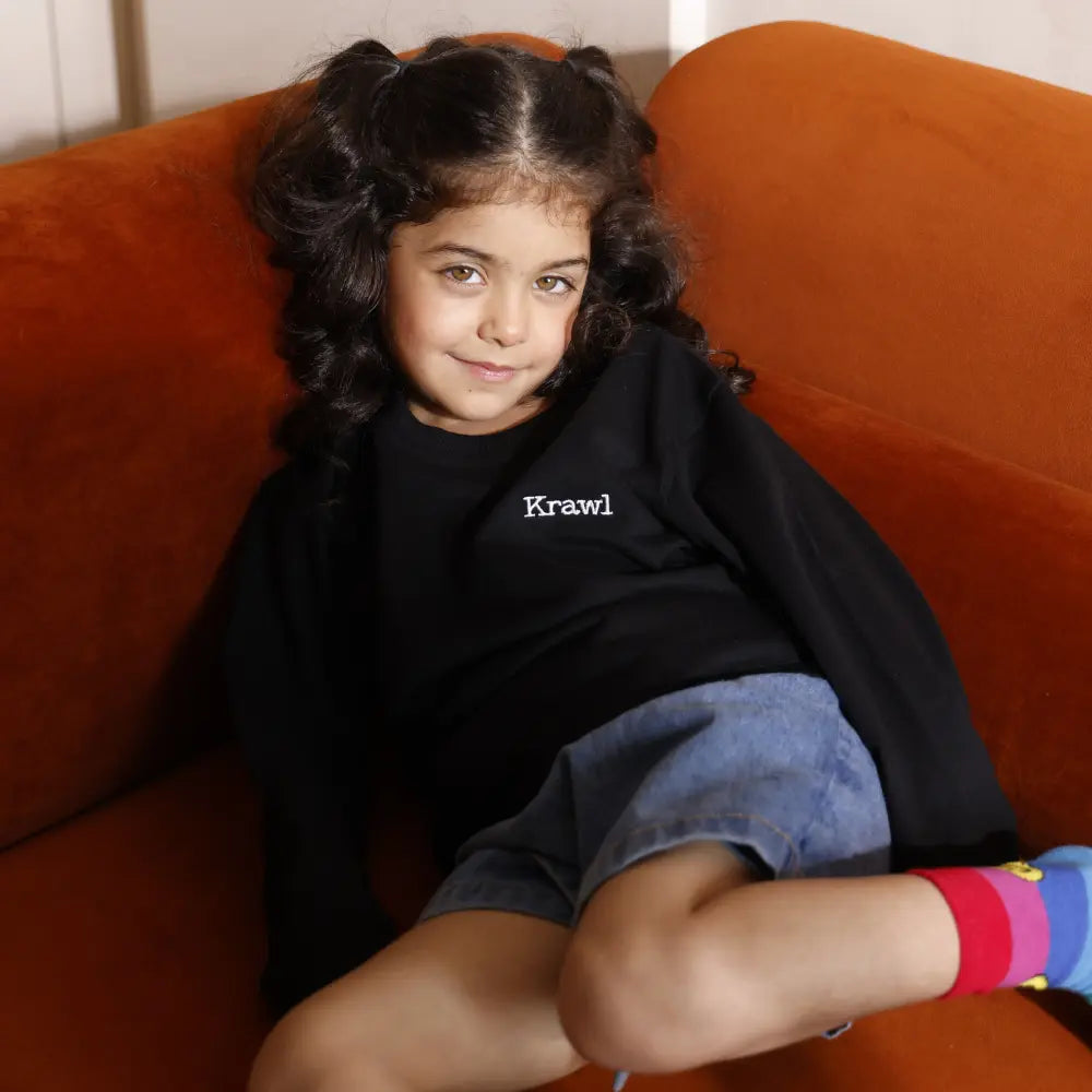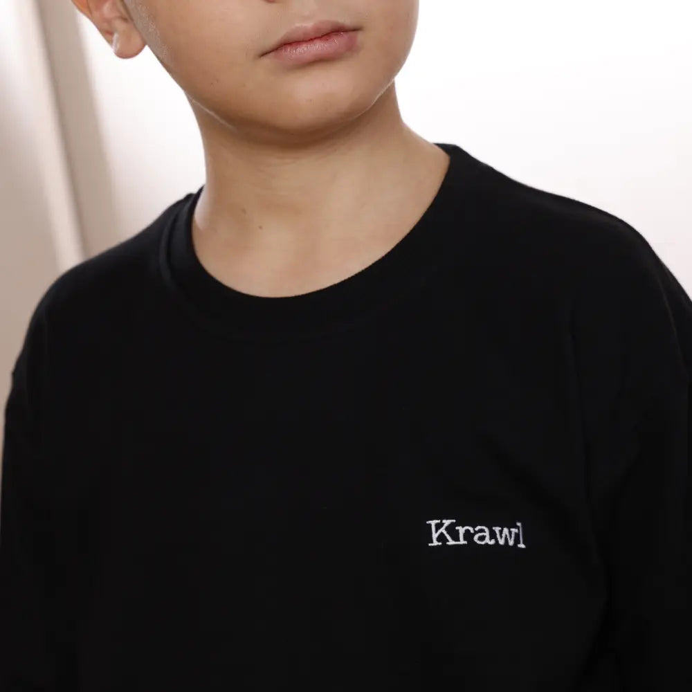 A milky-coloured long sleeve tee with an embroidered accent logo. A casual, relaxed fitting style with dropped shoulders and a round neckline.