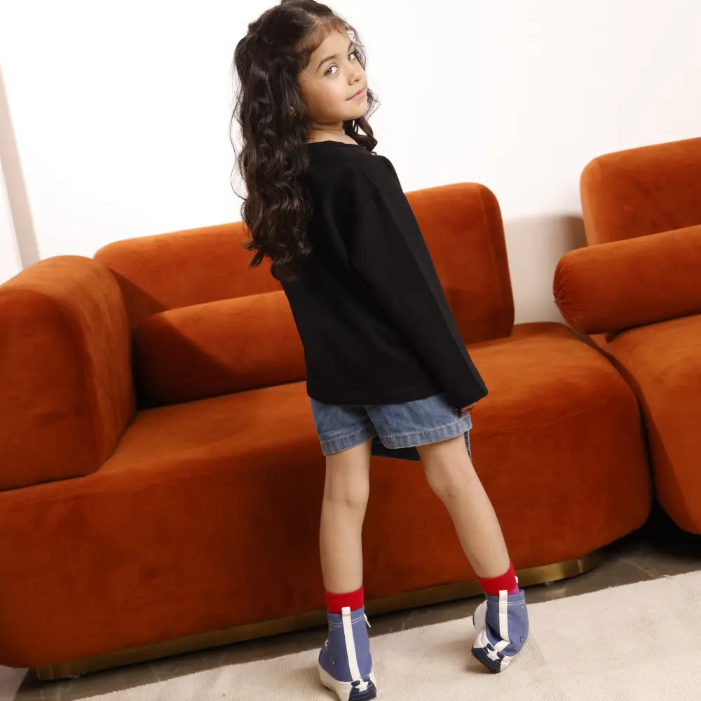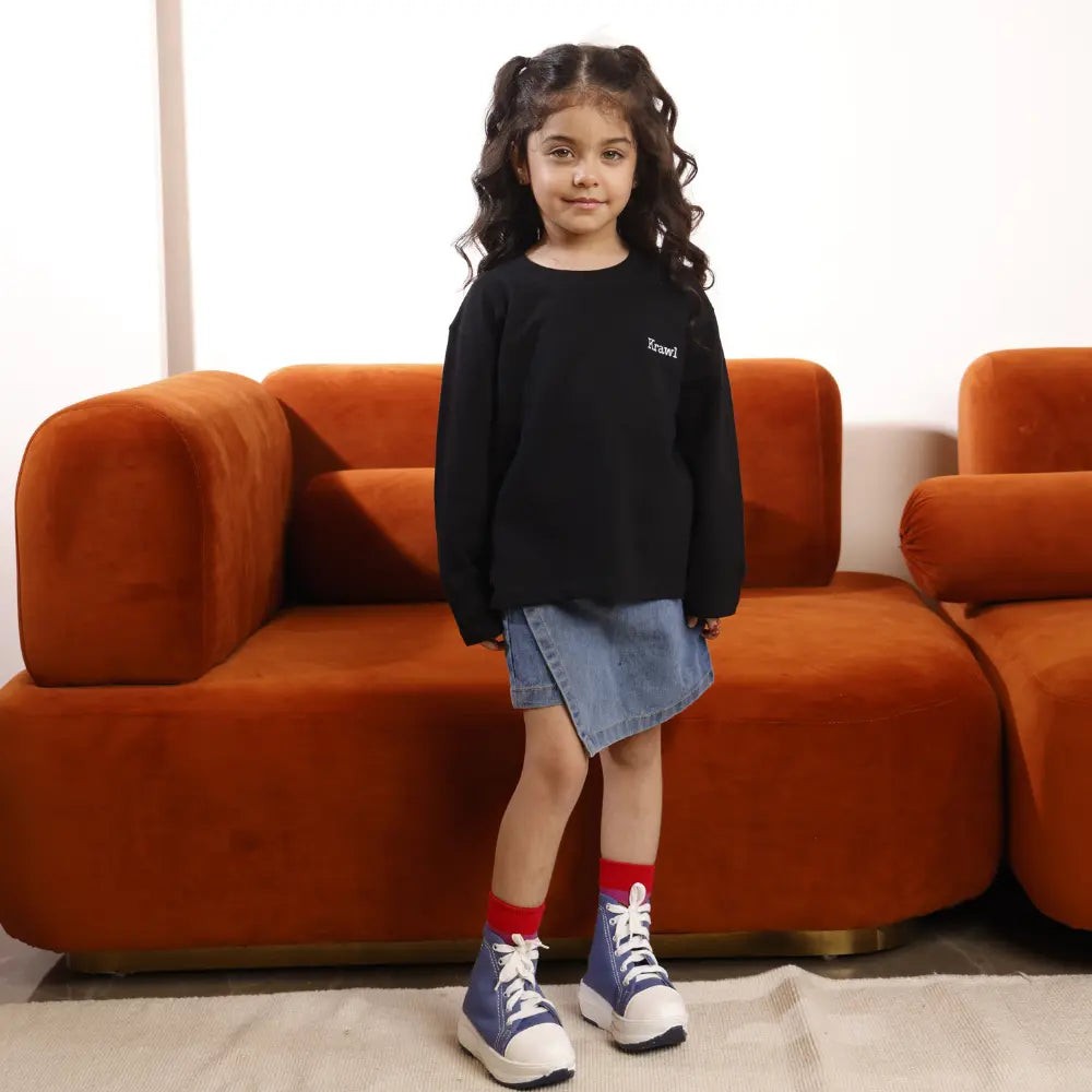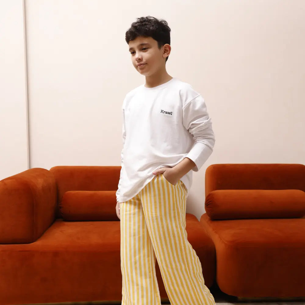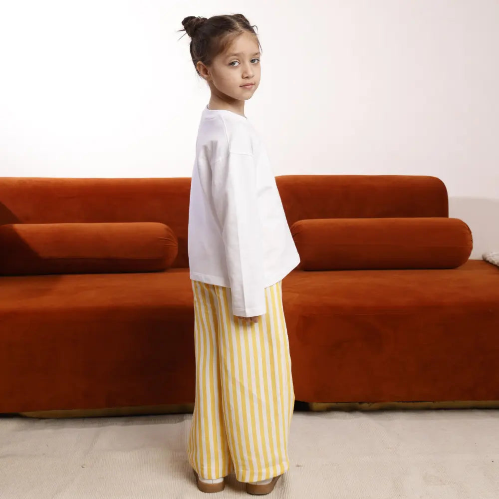 A milky-coloured long sleeve tee with an embroidered accent logo. A casual, relaxed fitting style with dropped shoulders and a round neckline.