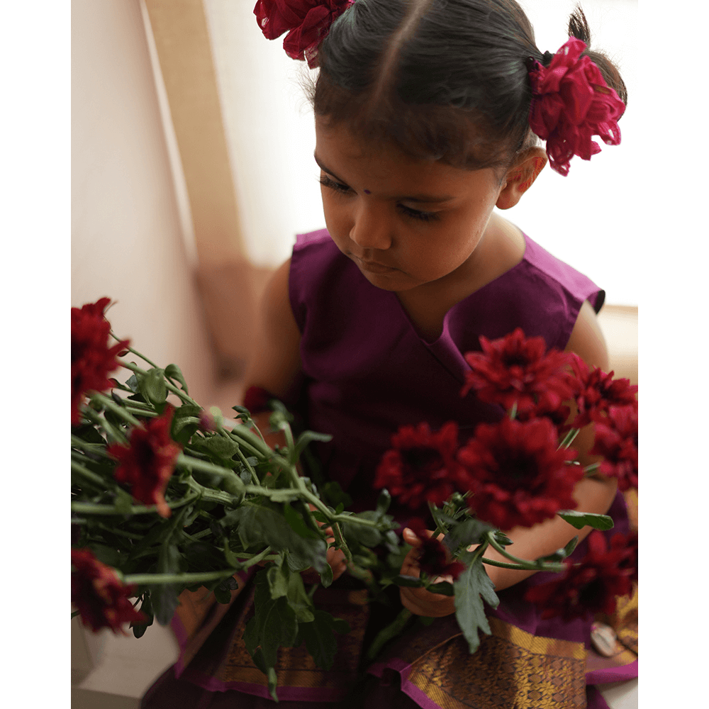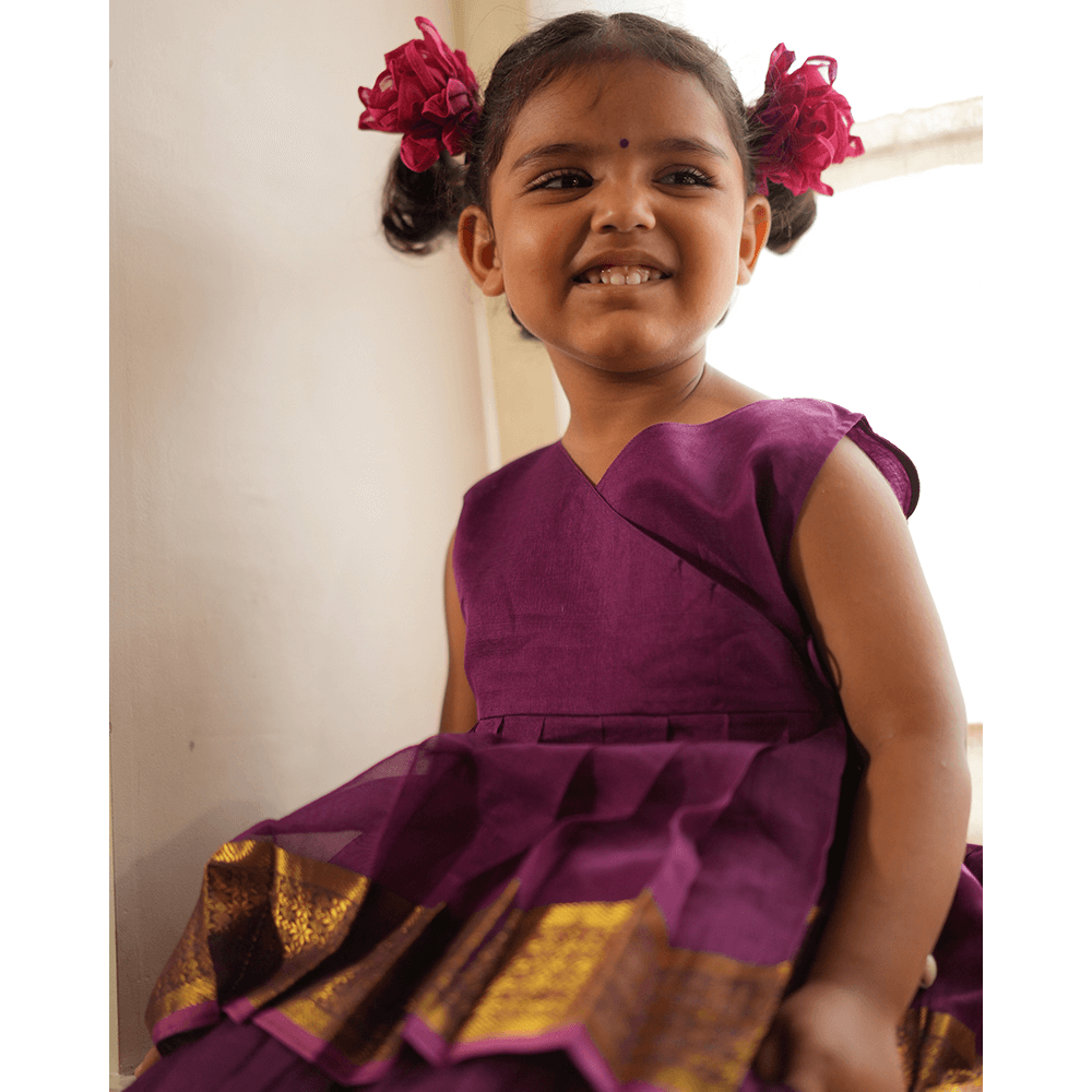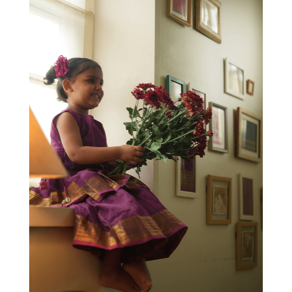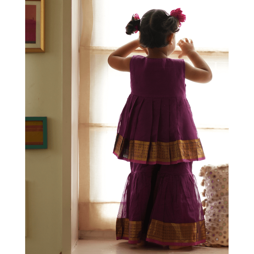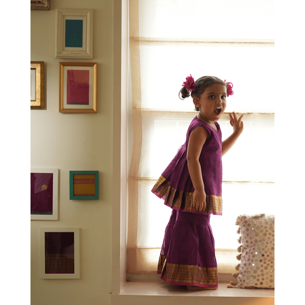 One of our best selling designs this time with a Sharara bottom as a coord in the most gorgeous shade of purple contrasted with a gold and pink selvedge detailing. This handwoven fabric spells love! This set is perfect for the wildflower souls that want to run free! We urge you to use the pieces as separates and give them a longer life instead of waiting for an occasion to come and go!