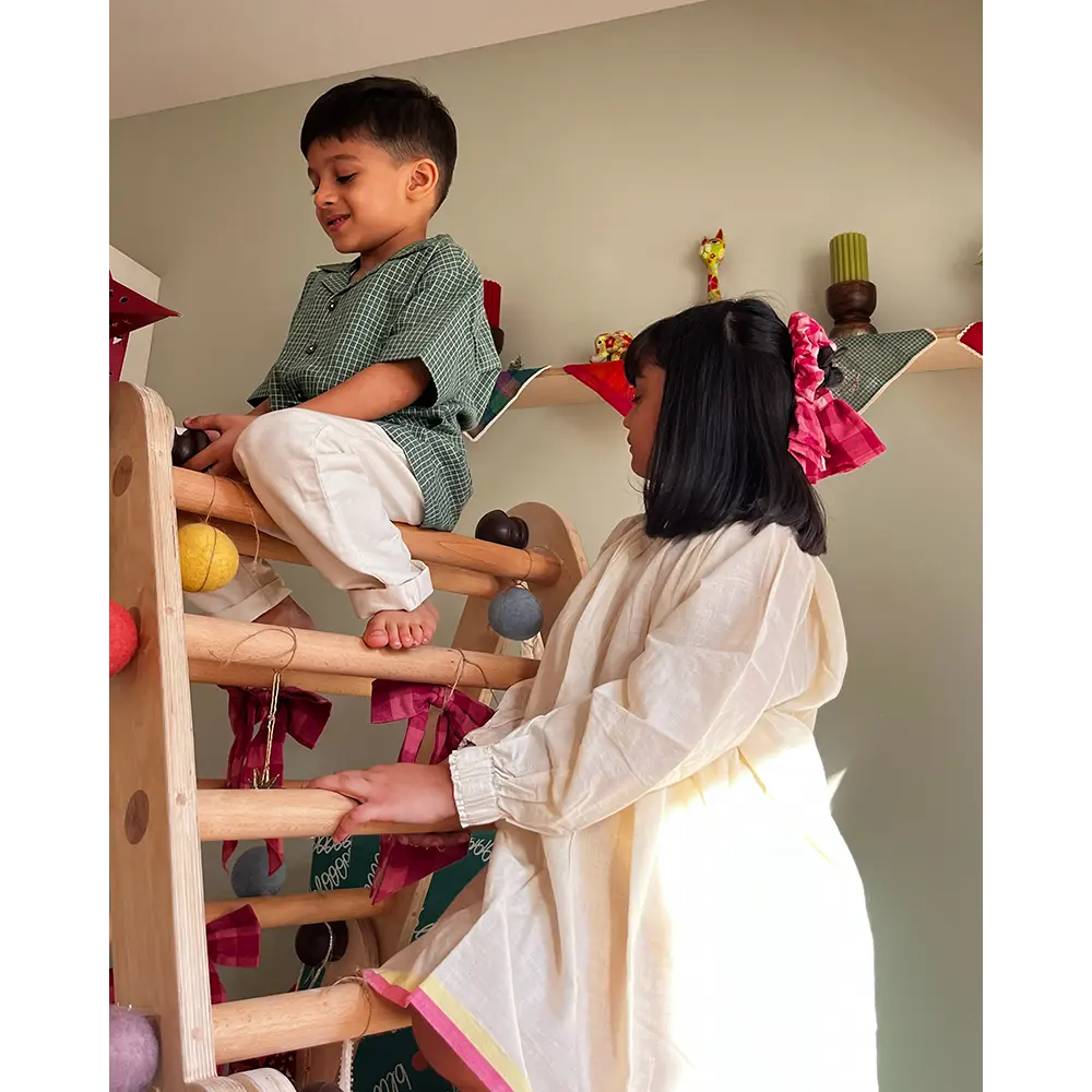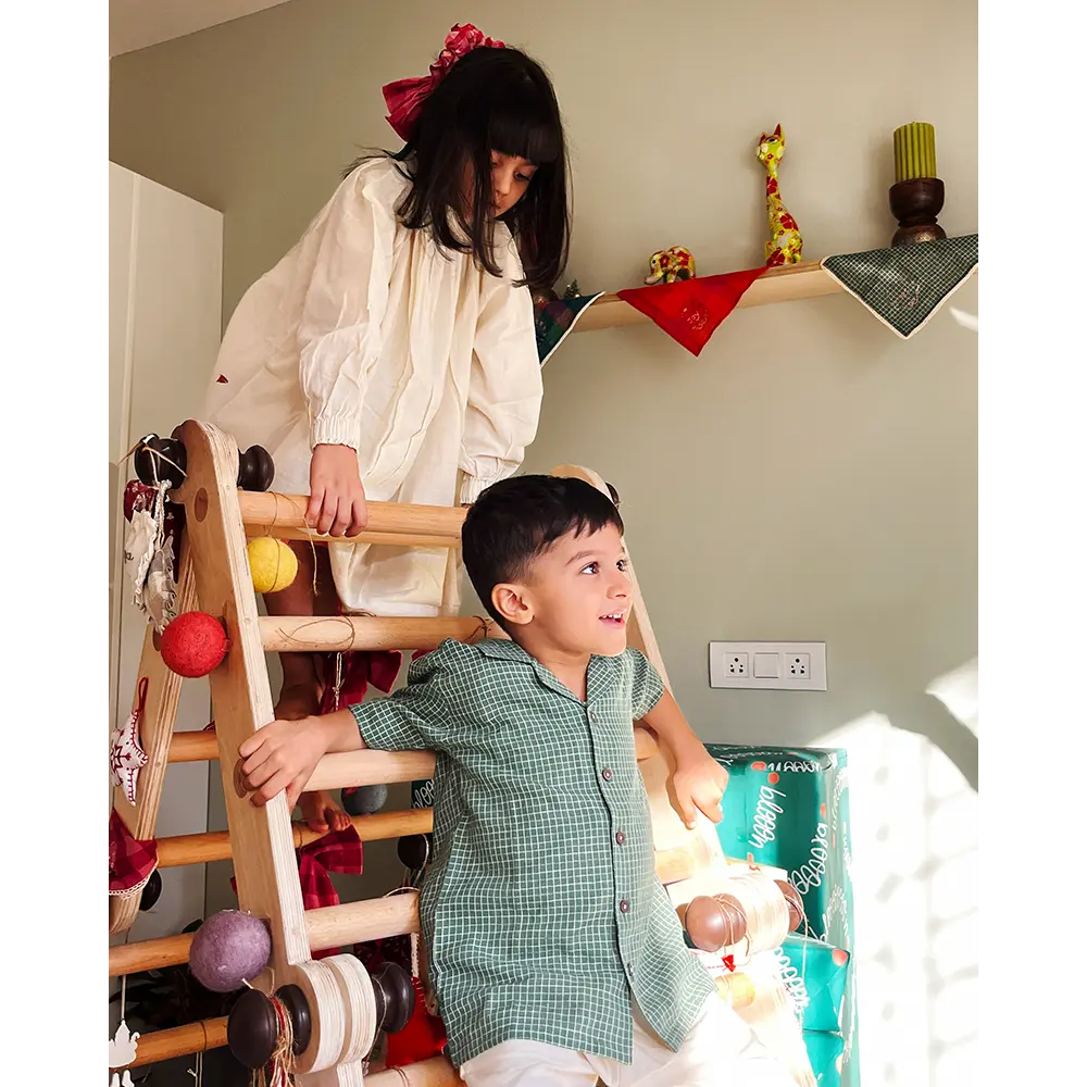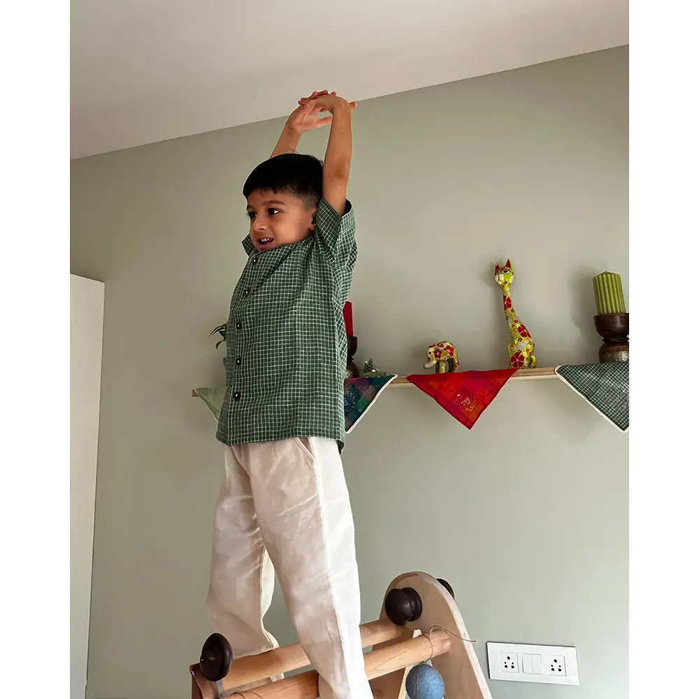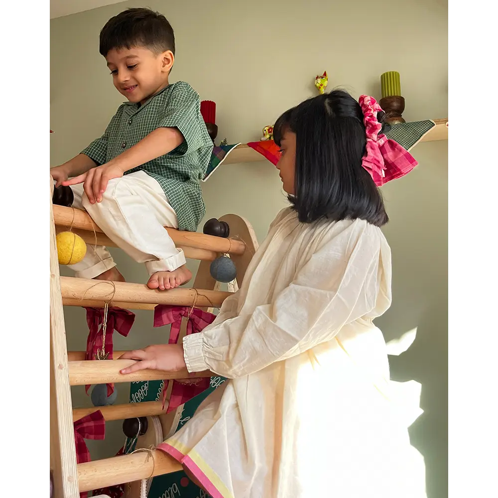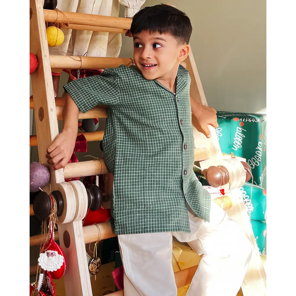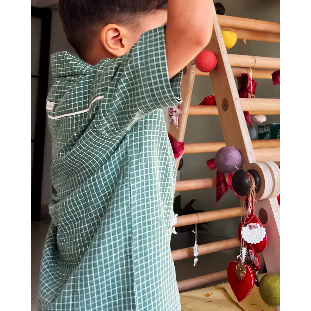 Bring out the festive fun with our ‘Boogie’ green checkered Christmas shirt — a comfy, handmade cotton shirt made for playdates, holidays, or cozy family gatherings. Soft, breathable handwoven cotton keeps your little one cool and happy all day long. The relaxed, loose-fit cut gives freedom to jump, dance, run and boogie around — no tugging or tightness, just pure comfort and joy. Whether it’s a Christmas playdate with friends or a holiday with cousins, this shirt brings the holiday vibe home. Its cheerful green check pattern and handmade charm also make it a favourite for festive photos and sibling twinning looks.