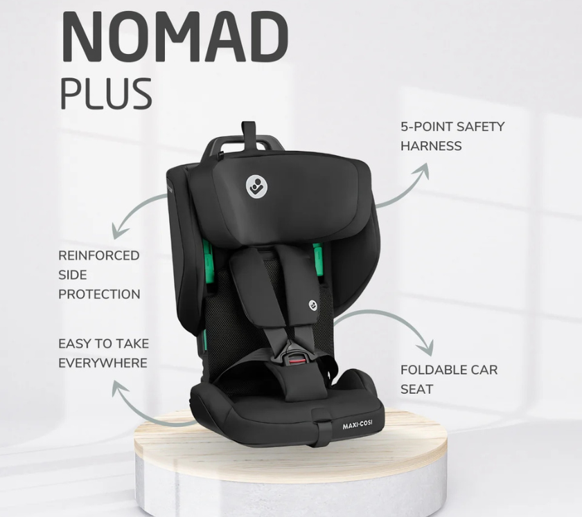 The Maxi-Cosi Nomad Plus is a travel-friendly high-back booster toddler car seat. The foldable design and carrying handle makes it ultra-compact and lightweight and fits into any car in just 30 seconds, so you can take safety and peace of mind with you, wherever you go. Easy to fold and carry along with the adjustable headrest and 5-point safety harness, the Nomad Plus has been designed for your freedom of travel.