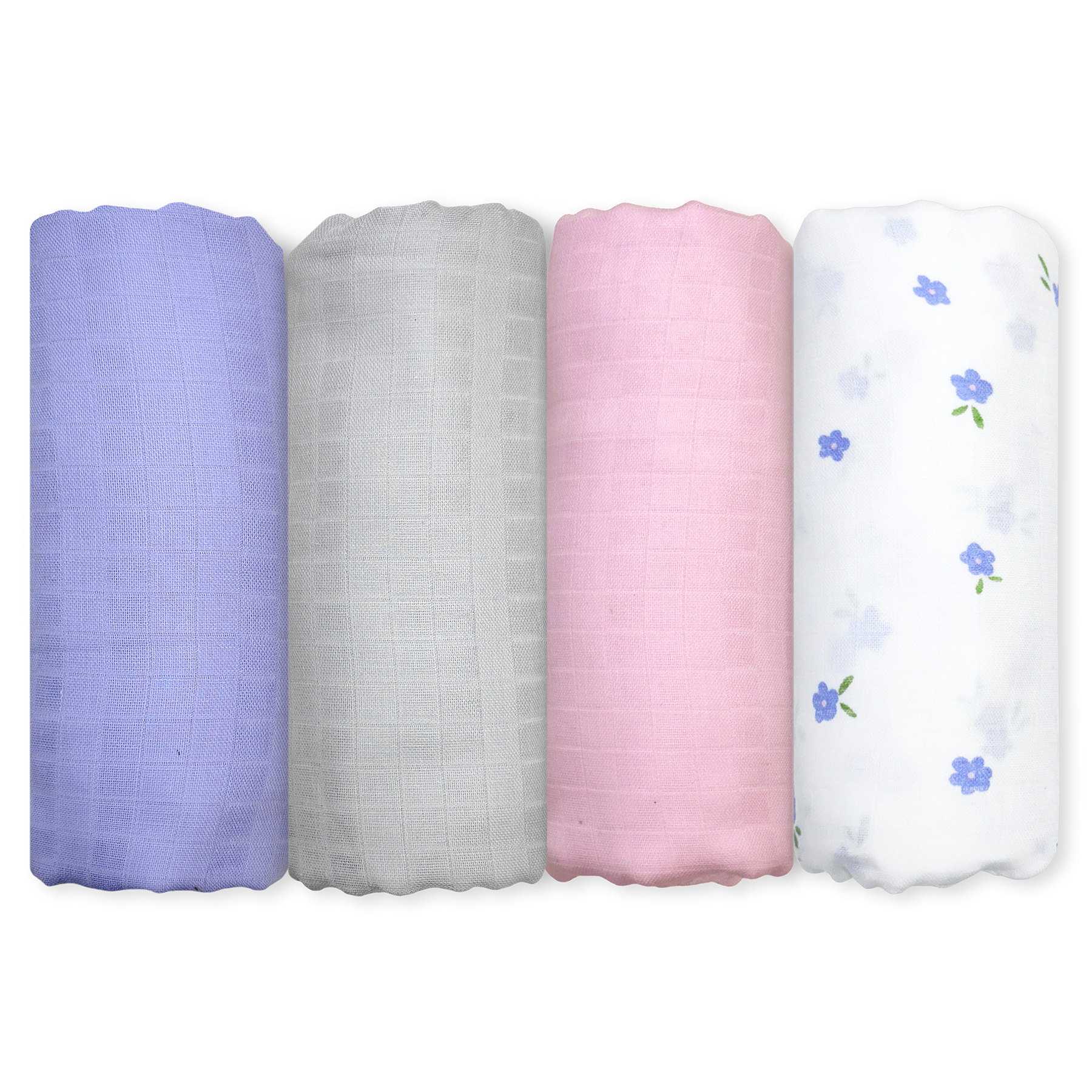- INCLUDES: Pack of three luxuriously soft 47" x 47" swaddles crafted from 100% organic cotton with delicate Pink Blossom, Yellow Blossom, and Purple Blossom prints