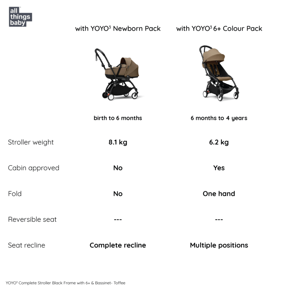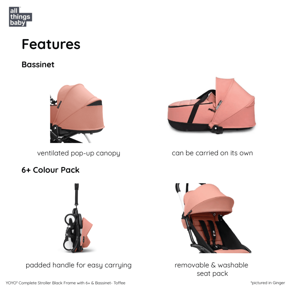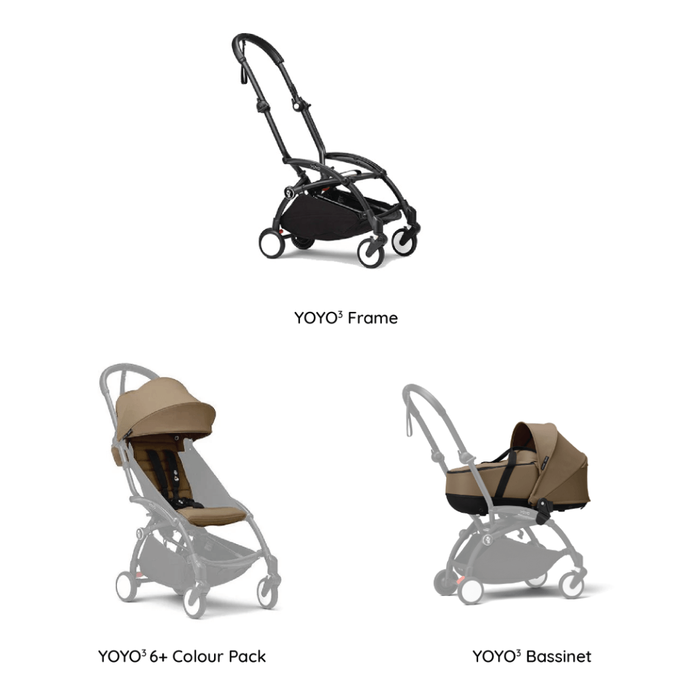 The YOYO3 Stroller with the Bassinet & 6+ Color Pack is versatile, ultra-compact, and super sturdy. The stroller grows with your child, can be used for newborn (with the bassinet) and 6 months+ (with the 6+ color pack).