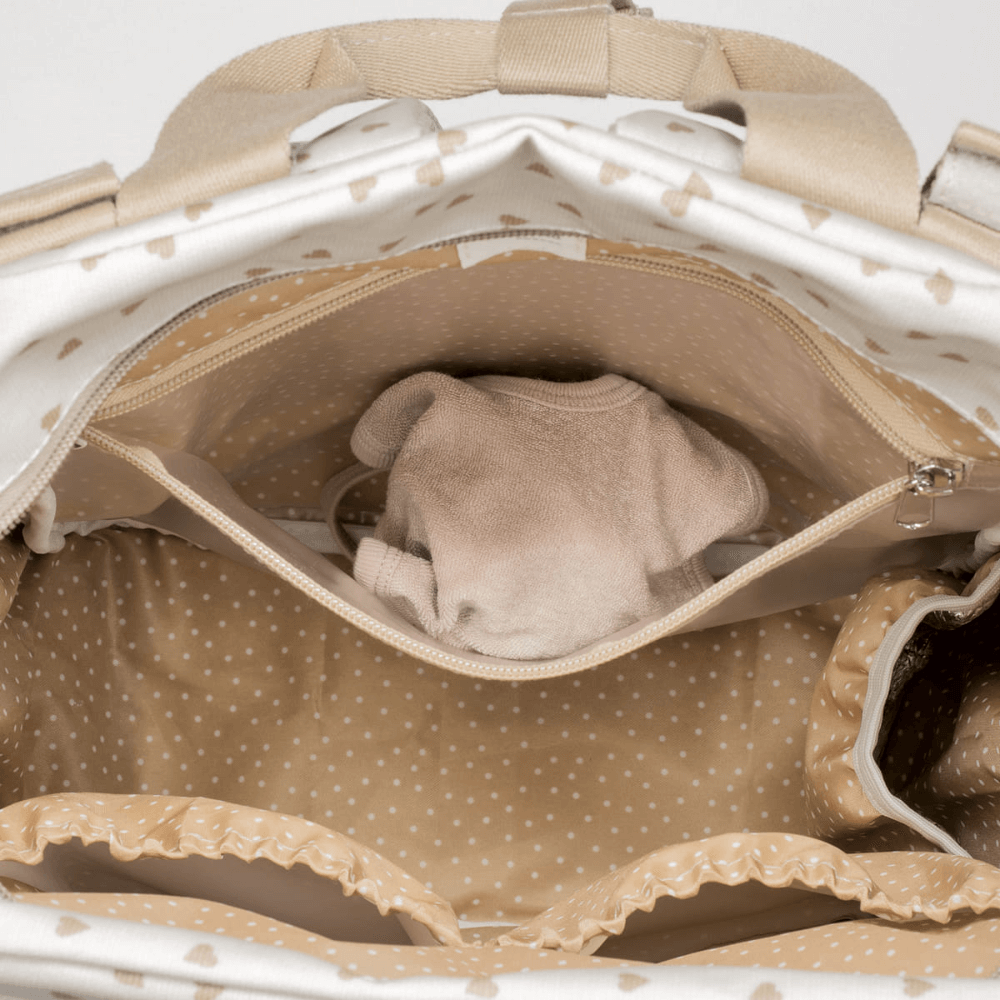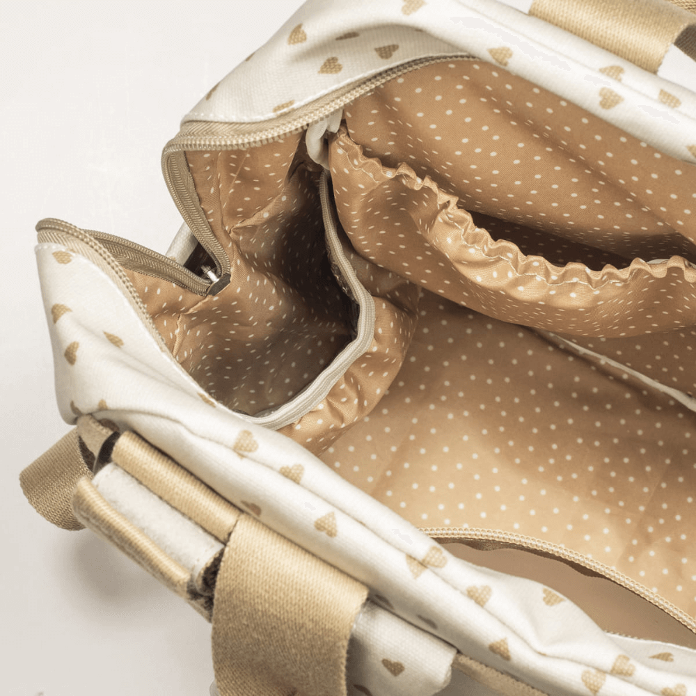The Poppy Cinnamon heart-patterned diaper bag for strollers is a versatile model that functions as both a basket bag and a backpack, combining modernity and urban style while allowing you to carry your items and your baby's essentials with ease and style during all your outings. This lightweight, durable, and spacious bag is designed to carry everything you need for your baby's outing. Its design includes multiple exterior and interior pockets for convenient organization, including pockets to secure bottles, elastic loops for utensils, compartments for wet wipes, and a water bottle holder. It also comes with a matching changing pad and a plastic-lined pocket to store wet clothes and isolate moisture from the rest of the bag. The bag features two adjustable short handles for easy attachment to any stroller model, as well as hand straps and padded shoulder straps for comfortable carrying on your back without causing discomfort from the weight. Made of high-quality, easy-to-clean material, it offers both durability and style. Walking Mum prioritizes your baby's safety by using the best fabrics, free of harmful dyes and substances. Our Walking Mum collection maintains the quality of the Pasito a Pasito brand but with a distinctive urban and modern style that stands out, offering a unique look for your outings with your baby. The maternity bags in this line are sportier and more practical, designed especially for modern parents who appreciate the latest trends without compromising on quality and functionality.