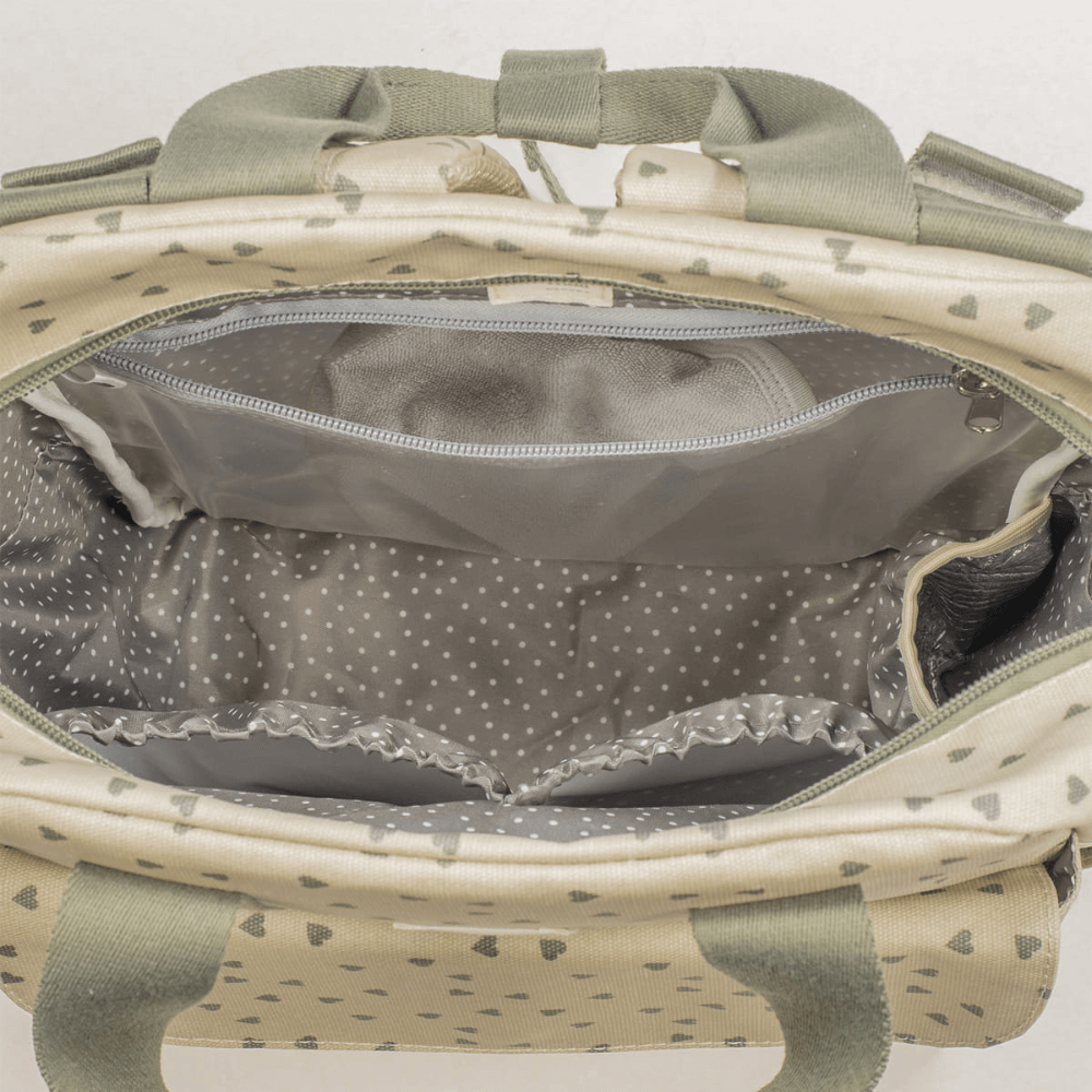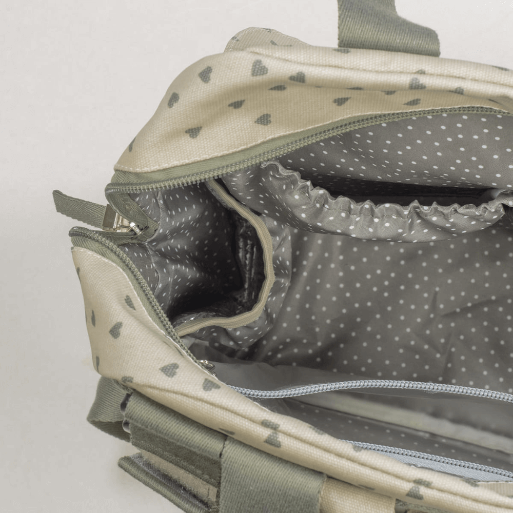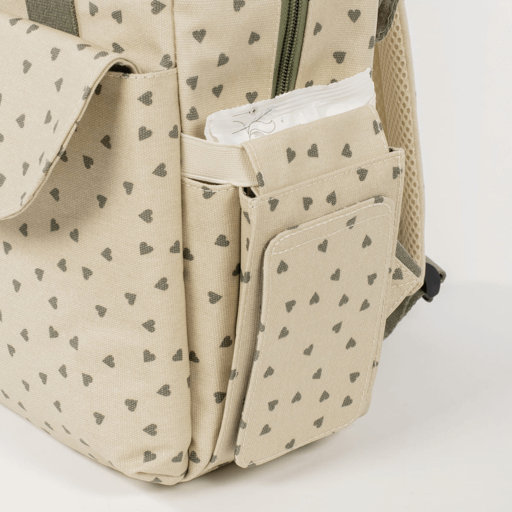The Poppy Moss heart-patterned diaper bag for strollers is a versatile model that functions as both a basket bag and a backpack, combining modernity and urban style while allowing you to carry your items and your baby's essentials with ease and style during all your outings. This lightweight, durable, and spacious bag is designed to carry everything you need for your baby's outing. Its design includes multiple exterior and interior pockets for convenient organization, including pockets to secure bottles, elastic loops for utensils, compartments for wet wipes, and a water bottle holder. It also comes with a matching changing pad and a plastic-lined pocket to store wet clothes and isolate moisture from the rest of the bag. The bag features two adjustable short handles for easy attachment to any stroller model, as well as hand straps and padded shoulder straps for comfortable carrying on your back without causing discomfort from the weight. Made of high-quality, easy-to-clean material, it offers both durability and style. Walking Mum prioritizes your baby's safety by using the best fabrics, free of harmful dyes and substances. Our Walking Mum collection maintains the quality of the Pasito a Pasito brand but with a distinctive urban and modern style that stands out, offering a unique look for your outings with your baby. The maternity bags in this line are sportier and more practical, designed especially for modern parents who appreciate the latest trends without compromising on quality and functionality.