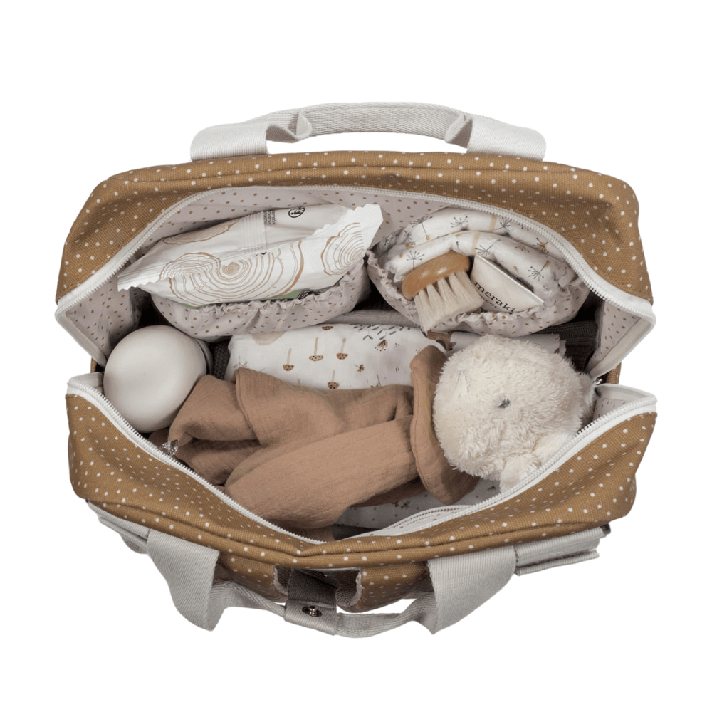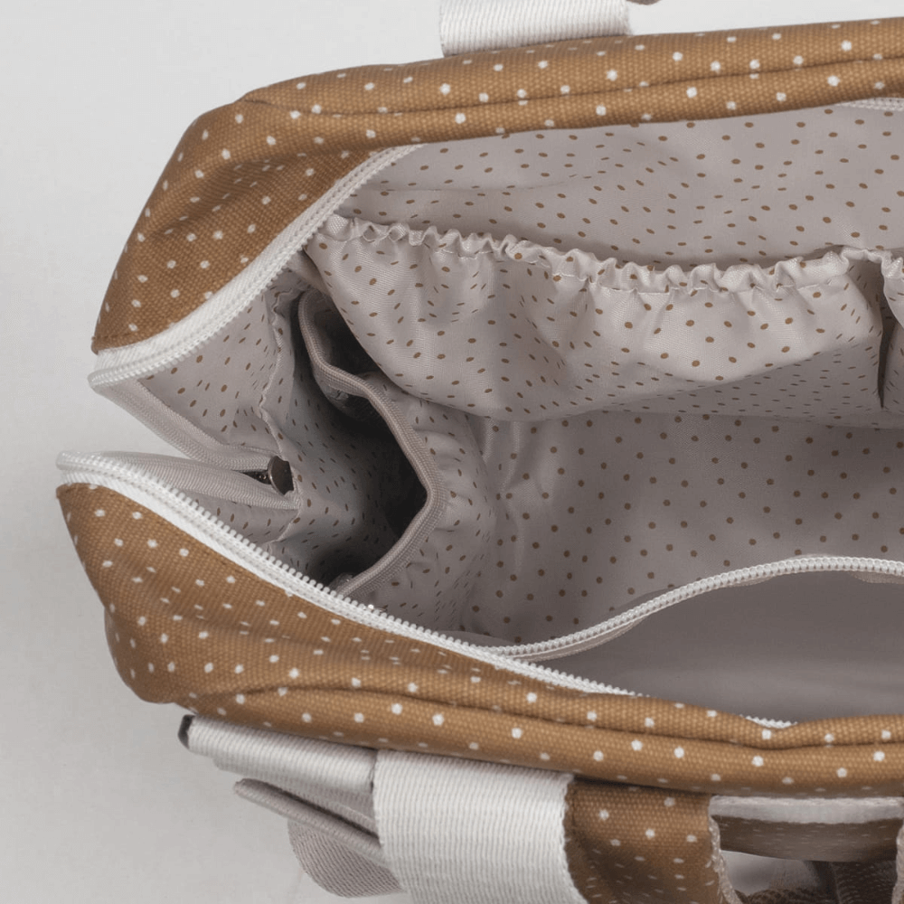 The Poppy Cinnamon polka dot diaper bag for strollers is a versatile model that functions as both a basket bag and a backpack, combining modernity and urban style while allowing you to carry your items and your baby's essentials with ease and style during all your outings. This lightweight, durable, and spacious bag is designed to carry everything you need for your baby's outing. Its design includes multiple exterior and interior pockets for convenient organization, including pockets to secure bottles, elastic loops for utensils, compartments for wet wipes, and a water bottle holder. It also comes with a matching changing pad and a plastic-lined pocket to store wet clothes and isolate moisture from the rest of the bag. The bag features two adjustable short handles for easy attachment to any stroller model, as well as hand straps and padded shoulder straps for comfortable carrying on your back without causing discomfort from the weight. Made of high-quality, easy-to-clean material, it offers both durability and style. Walking Mum prioritizes your baby's safety by using the best fabrics, free of harmful dyes and substances. Our Walking Mum collection maintains the quality of the Pasito a Pasito brand but with a distinctive urban and modern style that stands out, offering a unique look for your outings with your baby. The maternity bags in this line are sportier and more practical, designed especially for modern parents who appreciate the latest trends without compromising on quality and functionality.